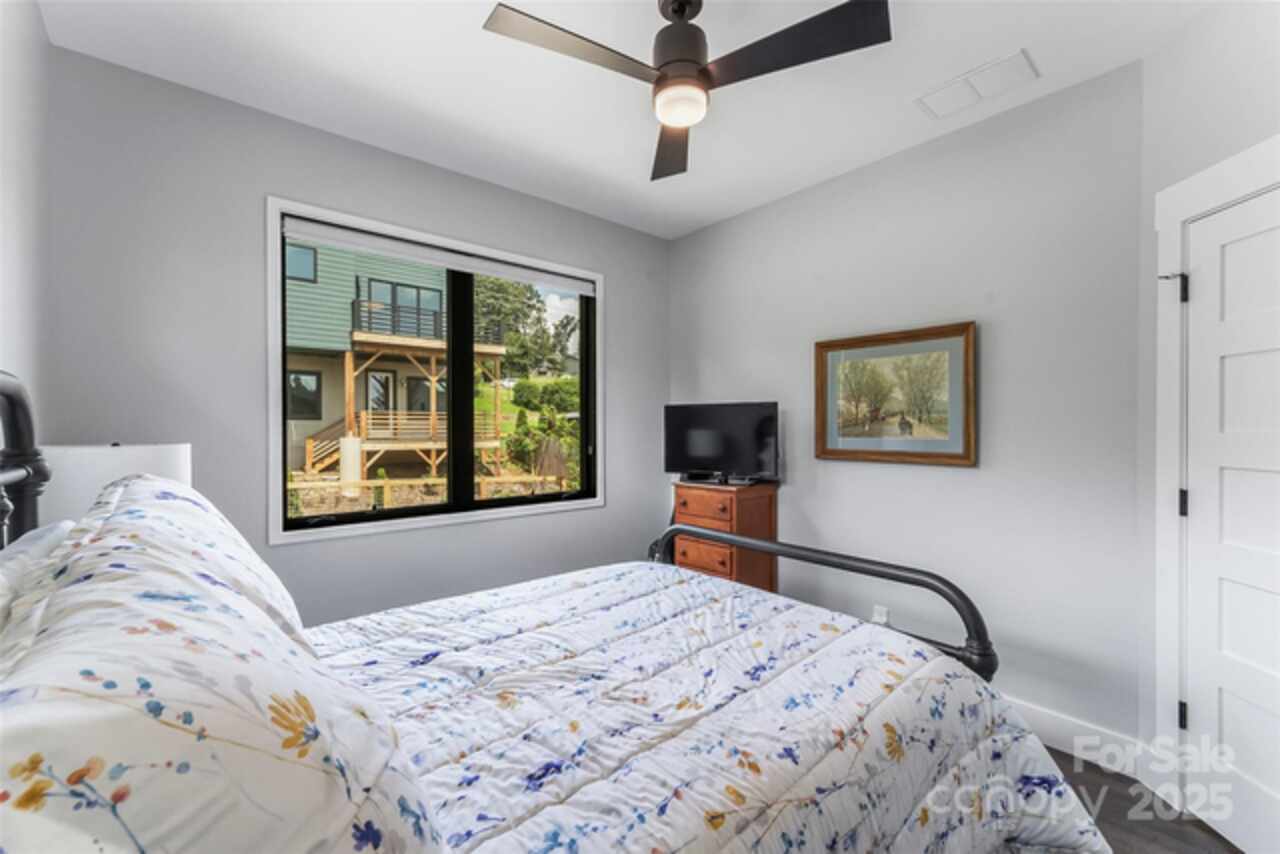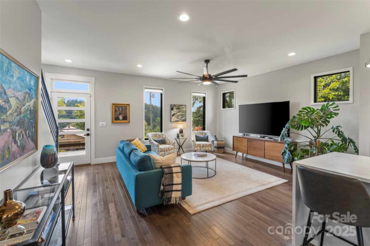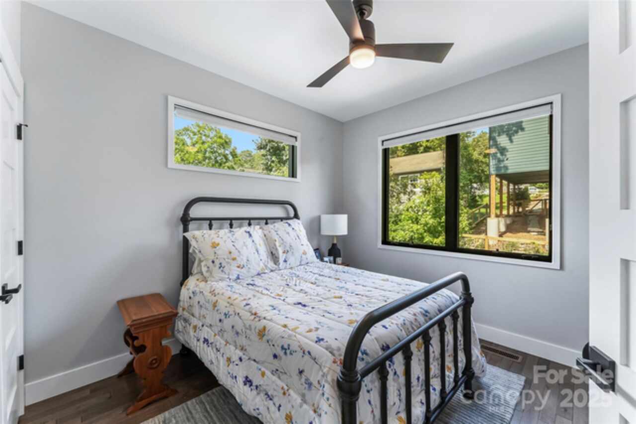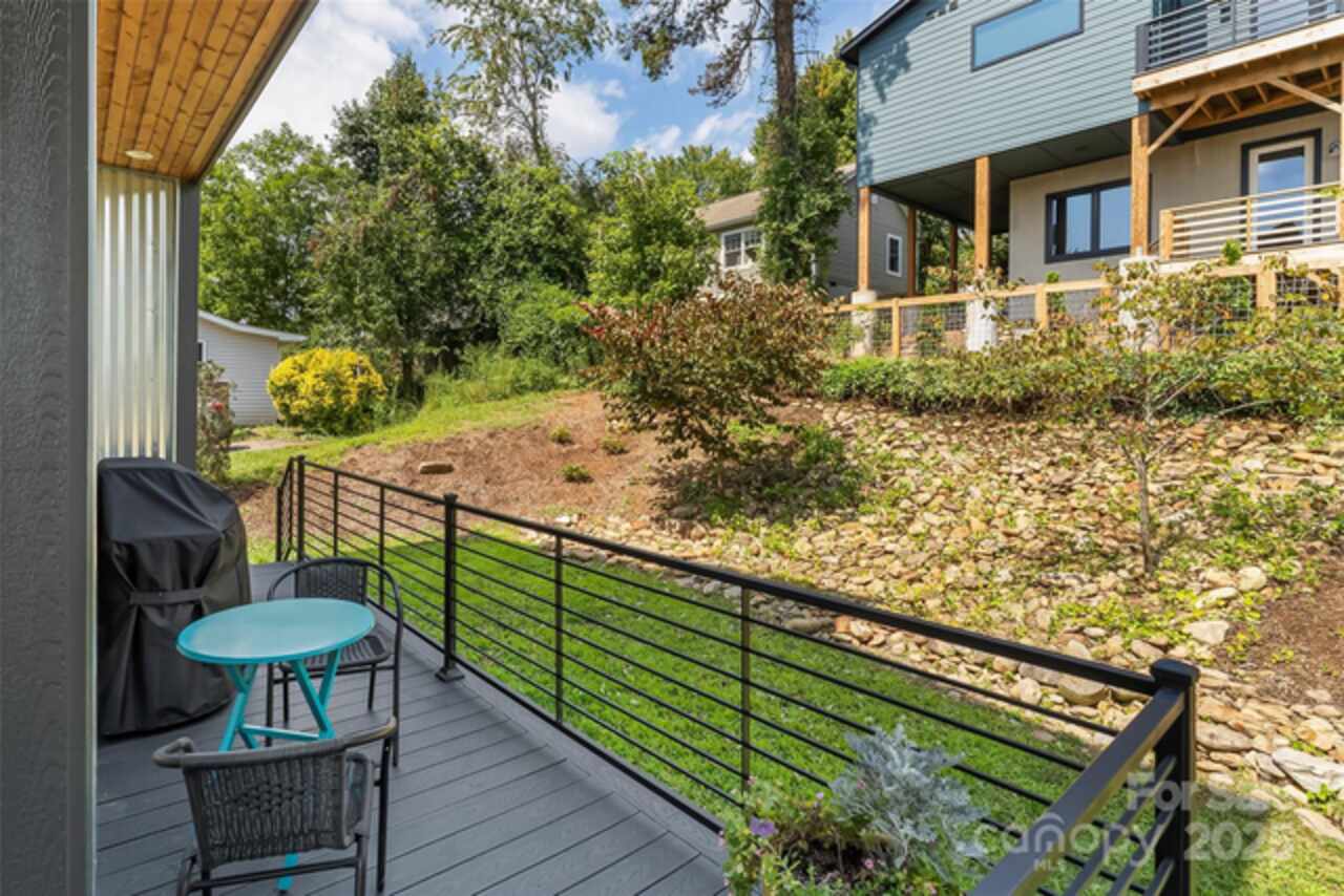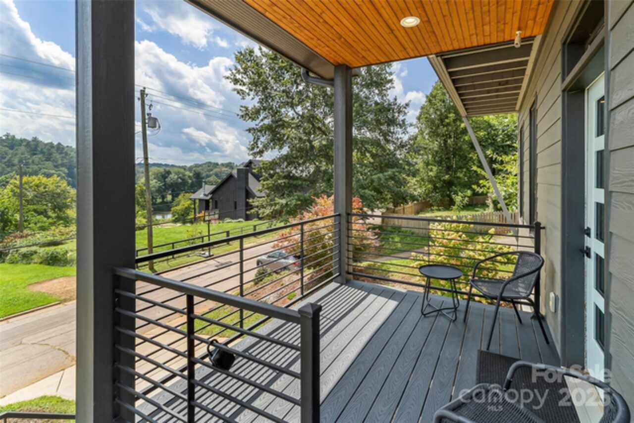 Highly desirable East-West Asheville location with French Broad River and mountain views, and walkable to the River Arts District! Located on a quiet street within walking distance to the river, Carrier park, greenways, shopping and dining. Enjoy views of the beautiful Biltmore property right across the river. House is only 5 years old and shows like new! Top quality materials used in this 3-story home with beautiful appointments including Hickory wood floors, ceramic tile bath floors, river stone and subway tile shower surrounds, quartz countertops, and upgraded lighting. Basement has a 1 car garage, utility room, a full bath and a finished flex room/bedroom with built-in cabinets for closet space or drop zone. Basement utility room has washer/dryer and sink hookups, although not currently in use. Main level has an open concept great room, dining room, kitchen and half bath with front, side, and back decks! Upstairs has the primary bedroom with ensuite bathroom, high vaulted ceiling and private balcony, as well as 2 other bedrooms, another full bath, and laundry. There is an extra parking pad off the top of the driveway. Enjoy the amazing views from both the front and back porches! NO HOA!! Washer, dryer and refrigerator included.
