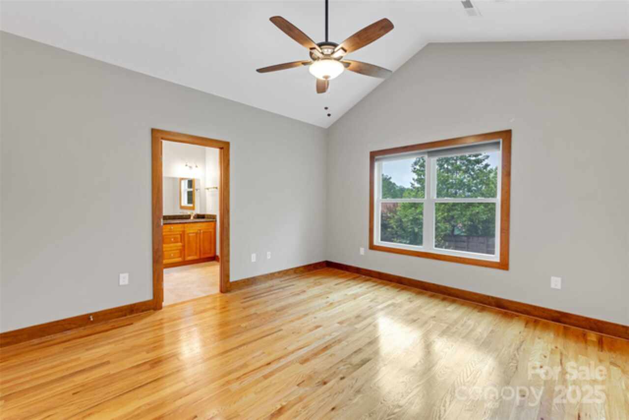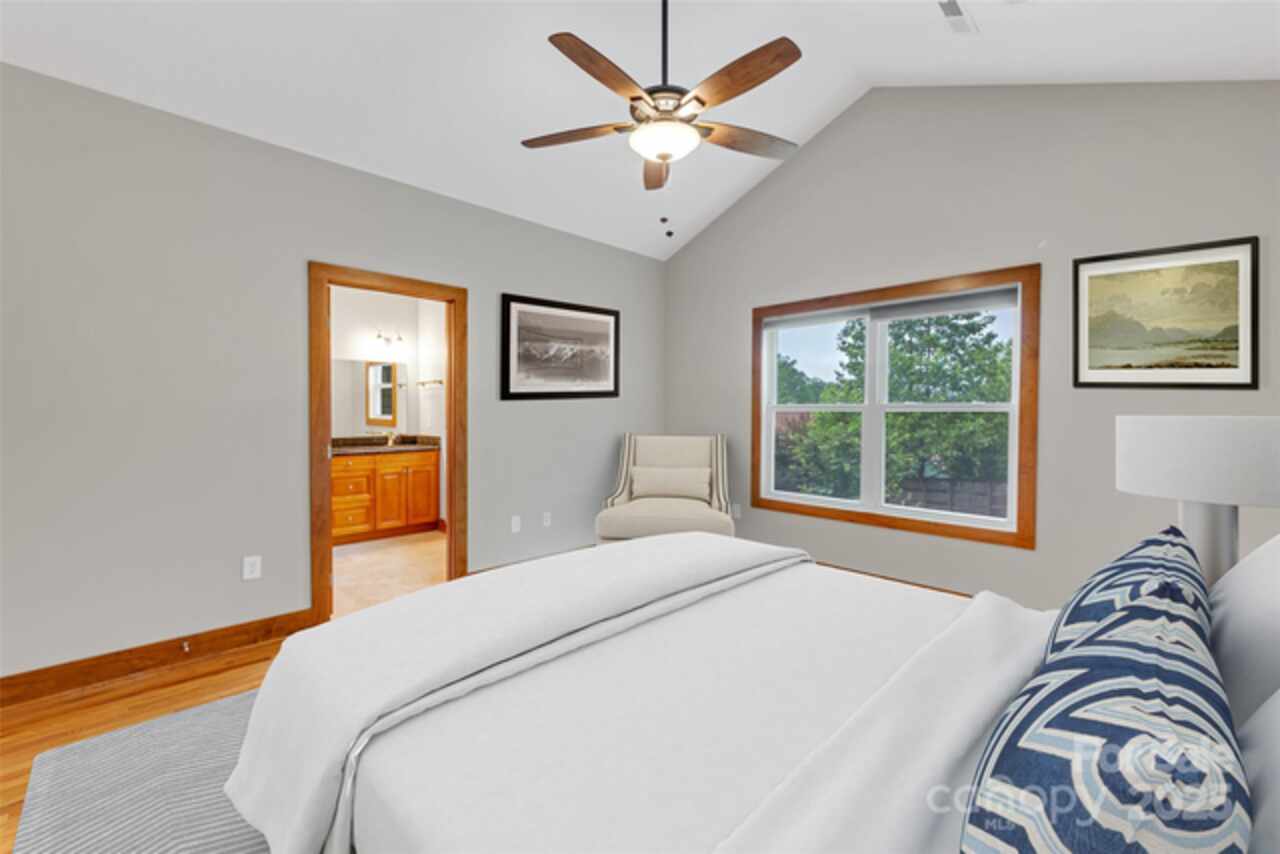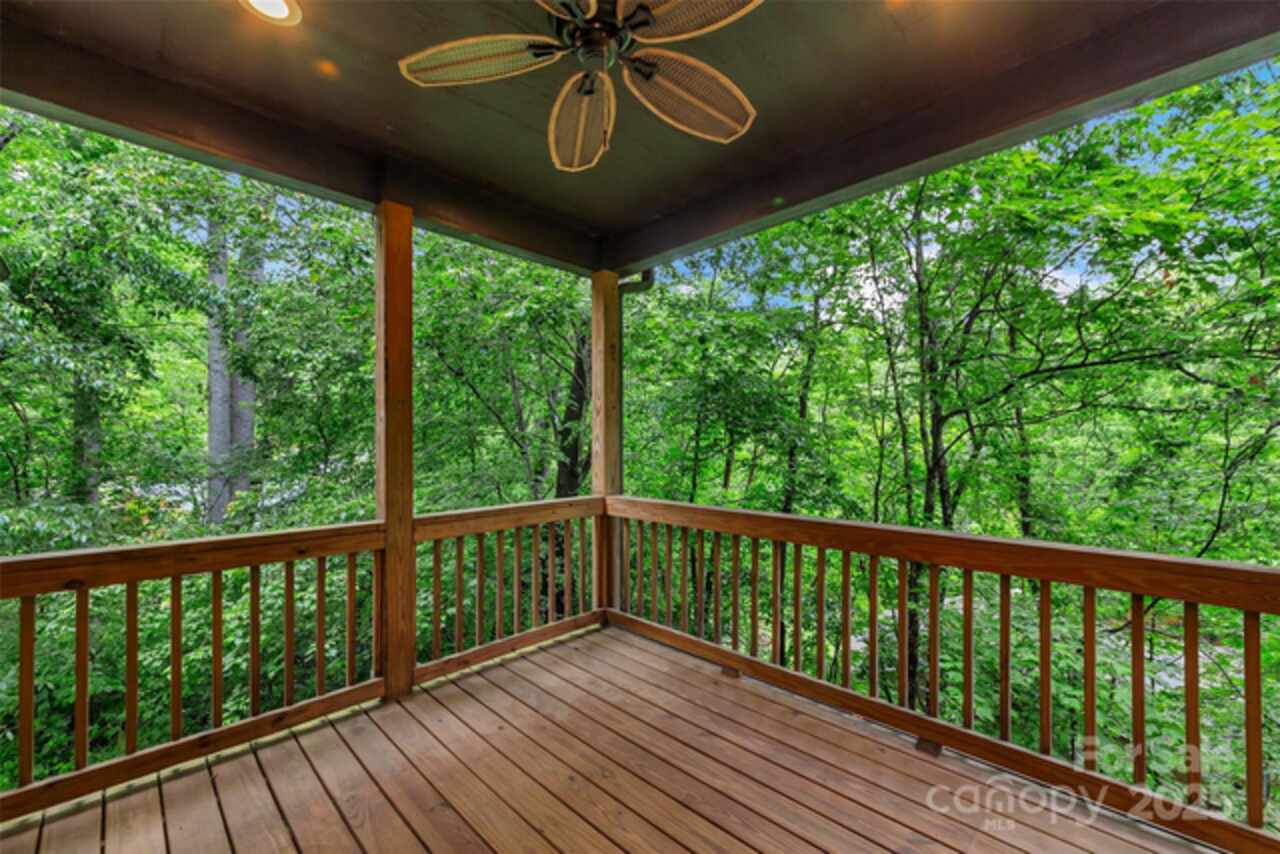 Welcome to your end unit townhouse in Black Mountain right on the Rainbow Trail to Montreat! No rental restrictions! This breathtaking space boasts beautiful oak hardwood floors and soaring 9’ ceilings, creating a bright and welcoming atmosphere. Chef's kitchen featuring generous 42” upper cabinets, soft-close drawers and doors, exquisite granite countertops, and modern stainless steel appliances. Private deck right off the living room—perfect for relaxing evenings or morning coffee. This unique unit has two master suites, each with spacious walk-in closets and en-suite bathrooms, ensuring your utmost privacy and comfort. One suite is oversized with room for sitting area or bunks. Could be spilt into 2nd and 3rd bedrooms with the straight forward addition of a wall. Both rooms have expansive seasonal mountain views. You'll love the convenience of a single-car garage with ample storage space & walk-in height crawl space under unit. 1.3 miles to the center of Black Mountain & Montreat.