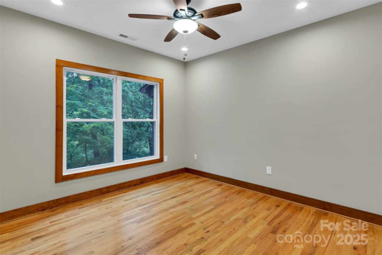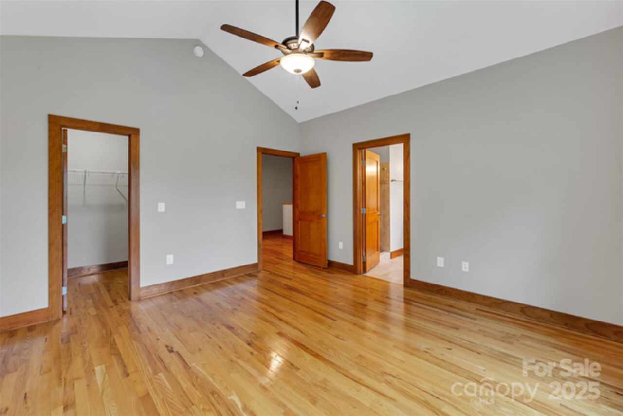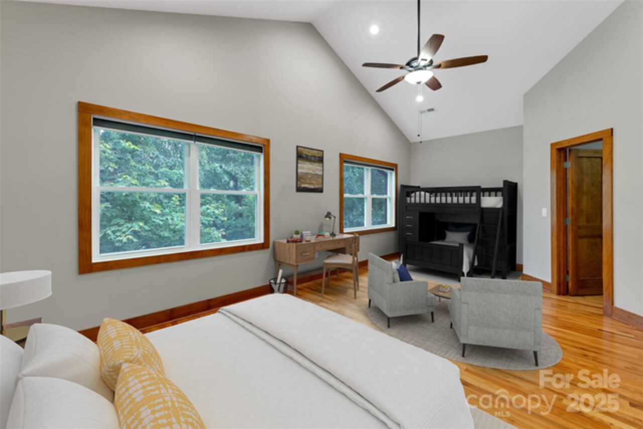 Welcome to your end unit townhouse in Black Mountain right on the Rainbow Trail to Montreat! No rental restrictions! This breathtaking space boasts beautiful oak hardwood floors and soaring 9’ ceilings, creating a bright and welcoming atmosphere. Chef's kitchen featuring generous 42” upper cabinets, soft-close drawers and doors, exquisite granite countertops, and modern stainless steel appliances. Private deck right off the living room—perfect for relaxing evenings or morning coffee. This unique unit has two master suites, each with spacious walk-in closets and en-suite bathrooms, ensuring your utmost privacy and comfort. One suite is oversized with room for sitting area or bunks. Could be spilt into 2nd and 3rd bedrooms with the straight forward addition of a wall. Both rooms have expansive seasonal mountain views. You'll love the convenience of a single-car garage with ample storage space & walk-in height crawl space under unit. 1.3 miles to the center of Black Mountain & Montreat.