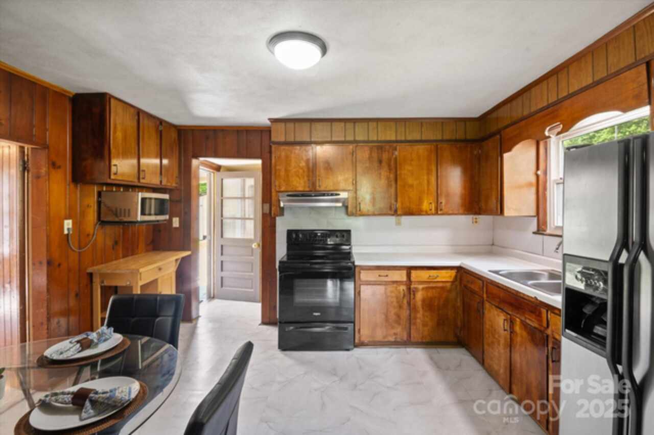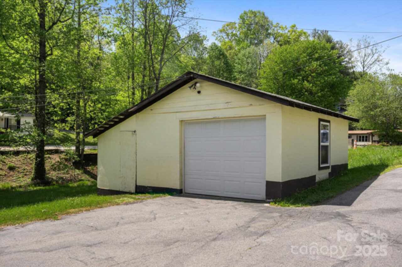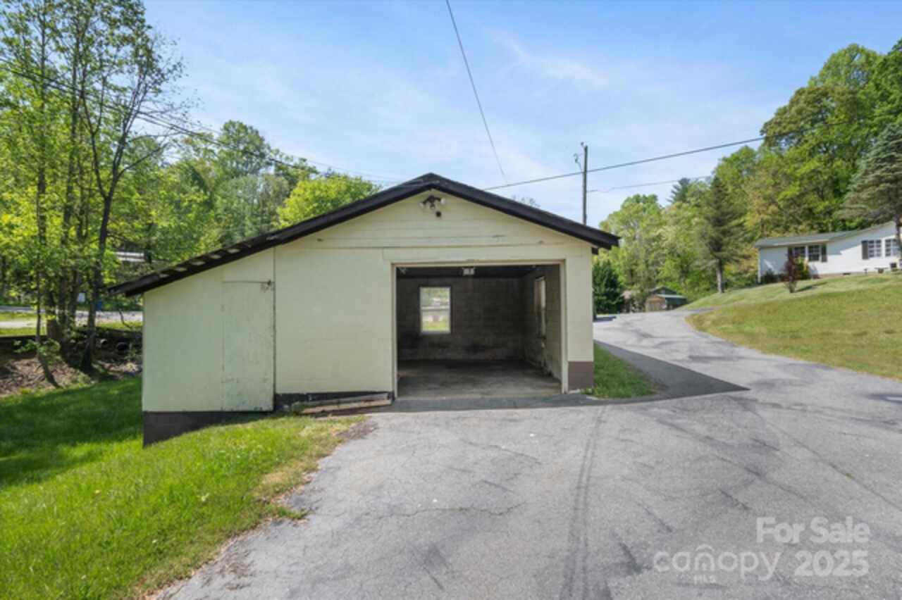 Nestled on a peaceful half-acre lot, this 3-bedroom, 1-bath cottage offers vintage charm, a functional layout, and unbeatable convenience. Located in a quiet neighborhood just 15 minutes from downtown Asheville, this home is perfect for those seeking a serene setting with easy city access. Step onto the inviting front porch and enjoy the sound of the creek and views of the garden. Inside, original knotty pine paneling, hardwood floors, and a wood burning fireplace add warmth and character, while brand-new carpet in the bedrooms brings fresh comfort. The spacious primary bedroom includes a custom closet for added storage. The kitchen and living areas provide a cozy layout that’s move-in ready yet offers room for updates. The full unfinished basement adds excellent storage potential or workshop space, and the detached garage adds flexibility for parking or hobbies. With a little TLC, this charming property is ready to shine—don’t miss the opportunity to make it your own!