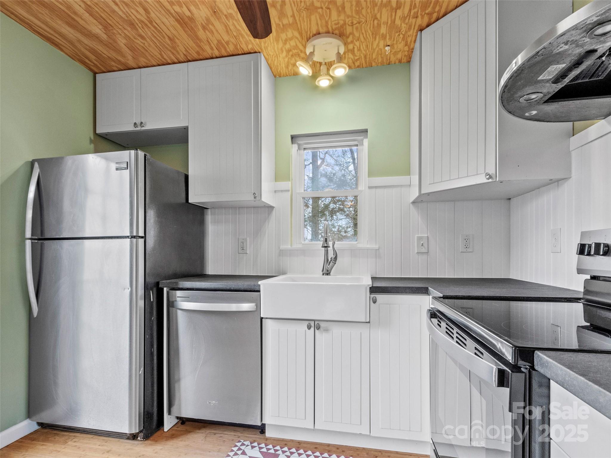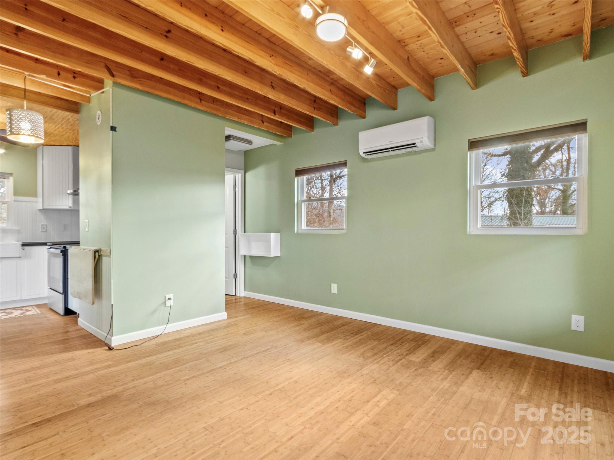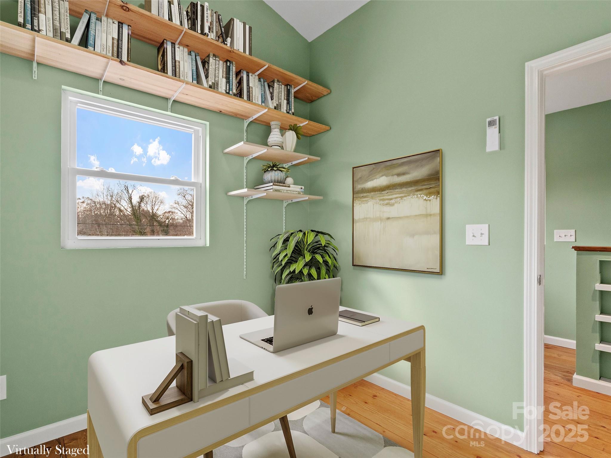 Charming 2-bedroom, 2- bath Compact Cottage in Asheville. This well-maintained home features bamboo flooring throughout the main level and pine flooring upstairs. At the top of the stairs a versatile sitting or office nook includes a built-in bookcase. Recent updates include a new Mitsubishi mini split system, stove and gutters. Home also offers a natural gas water heater for efficiency utility performance. The exterior is made of composite wood. The fully fenced 0.15-acre lot provides privacy and outdoor enjoyment with raised flower beds ready for plating. A thoughtfully designed property in a convenient Asheville location, perfect for low maintenance living with character.