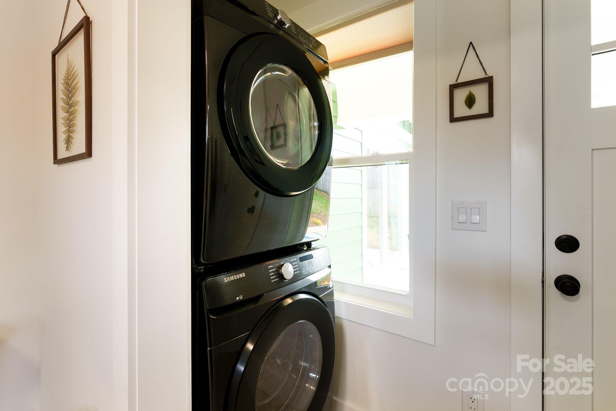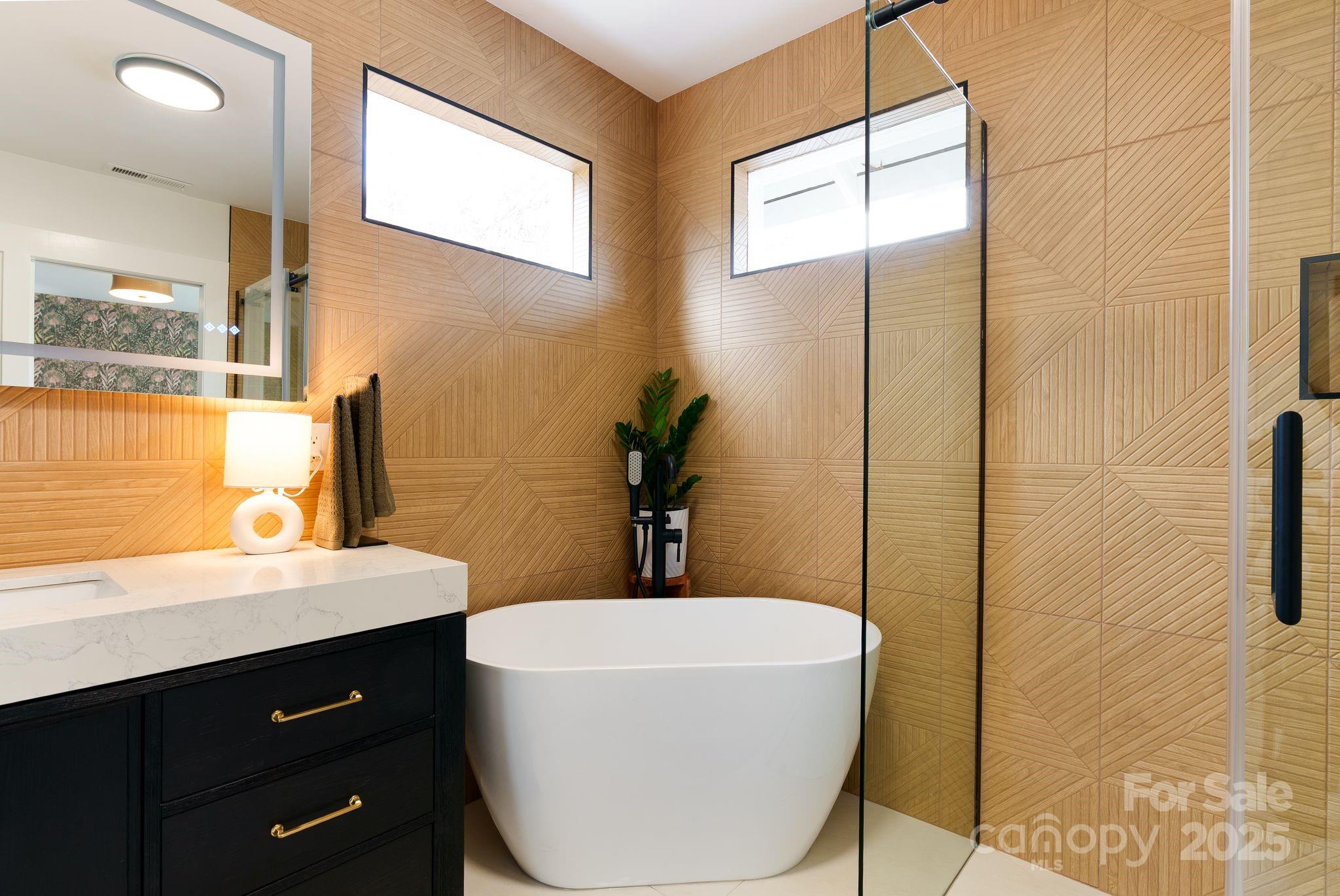 This beautifully renovated cottage offers a modern, main-level lifestyle, having been taken down to the studs and reconfigured. It features 3 bedrooms, 2 bathrooms, and an open-concept living area with new windows that flood the space with light. The home is situated on an elevated lot, just one block from the vibrant Haywood corridor in the heart of West Asheville. The stunning new “eat-in” kitchen boasts quartzite counters, oak-faced cabinets, soft-close drawers, a trash cabinet with dual bins, and a pull-out spice rack. A custom hood vent complements the gas stove. The primary suite is a true retreat, featuring a gorgeous modern soaking tub, a separate walk-in shower, a solid oak vanity, and a large-format (48” x 36”) anti-fog, three-level dimmer vanity mirror. It includes stunning bamboo-look wall tile and an attached laundry area with a stackable washer/dryer and a mini-mudroom, which opens onto the rear porch and deck. The light-filled rear bedroom also opens to a newly built deck, connecting to the rear porch and a small, private, west-facing backyard. For storage, the exterior-access basement has been partially encapsulated, offering ample room.